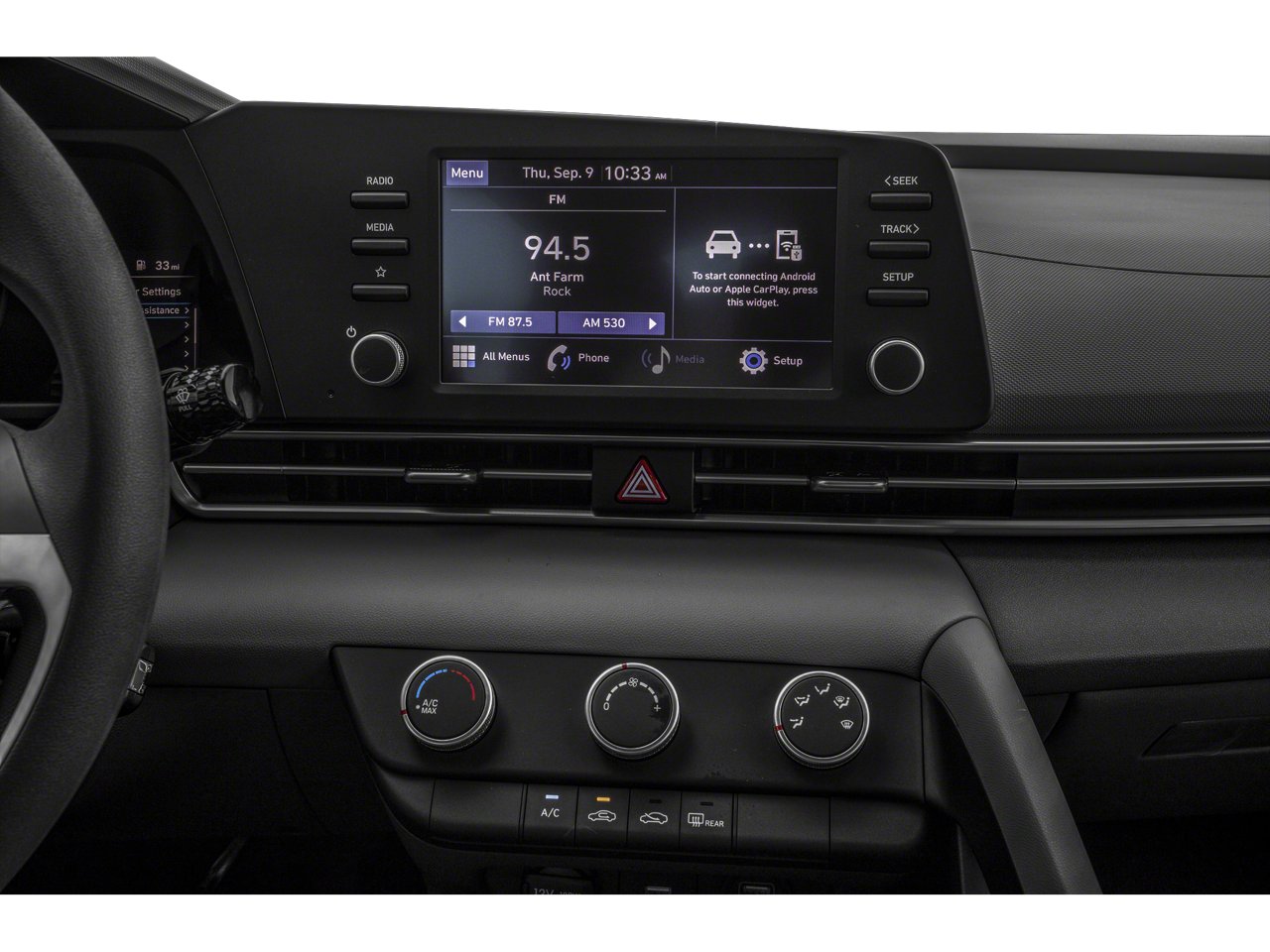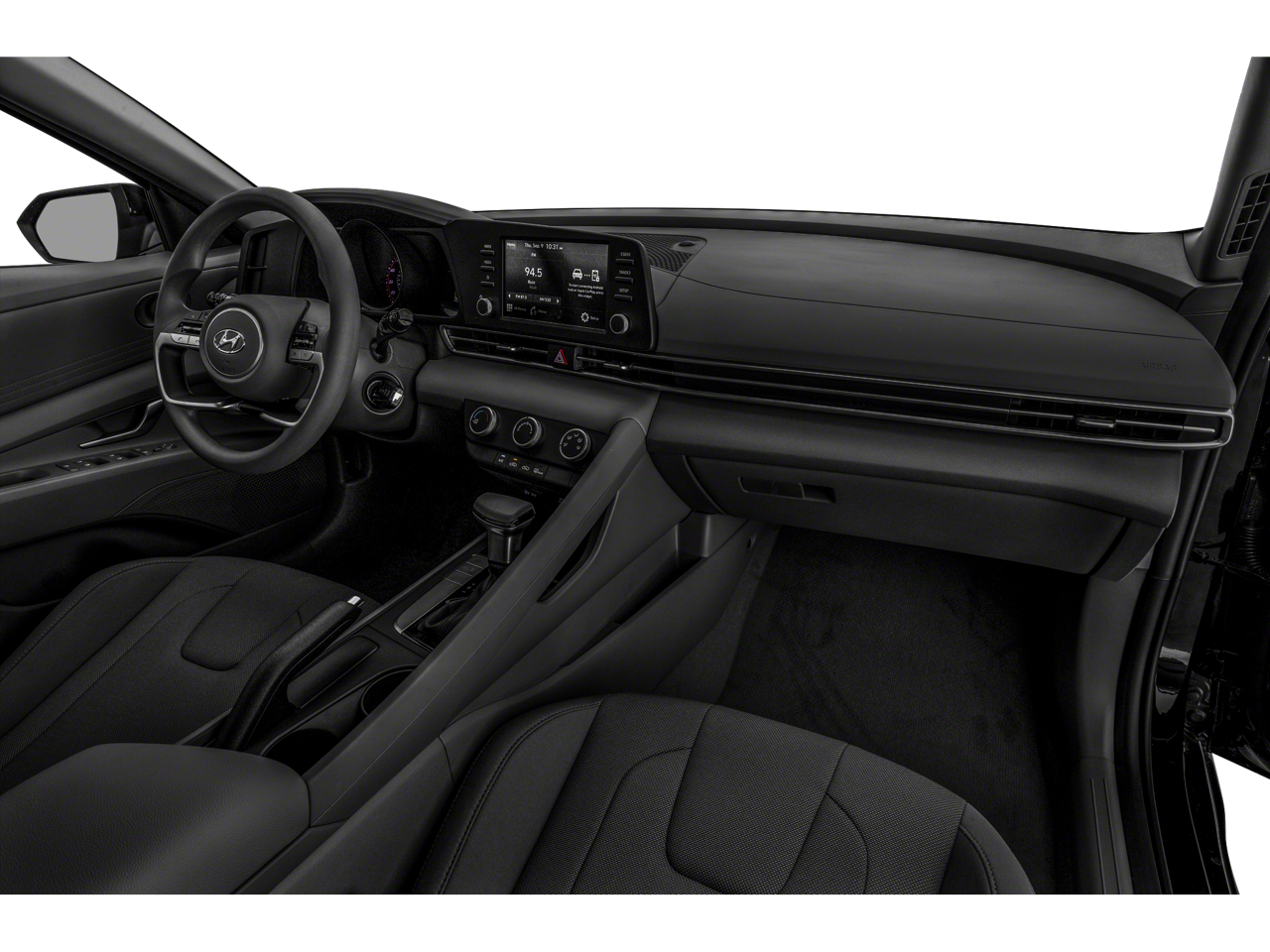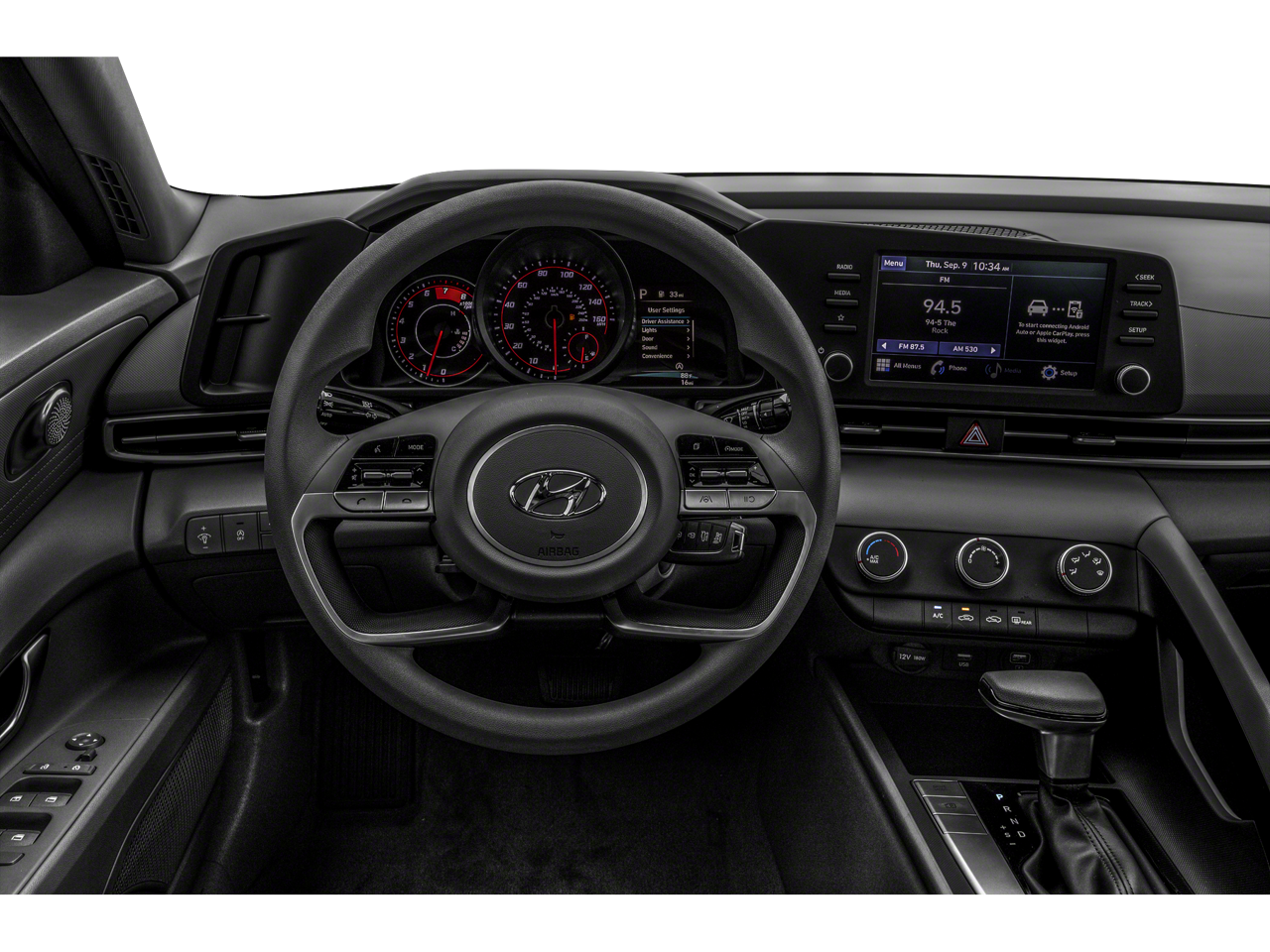 Step inside the Elantra SE and experience the epitome of modern comfort and convenience. The spacious cabin is outfitted with - 4 Speakers - AM/FM radio - Radio: AM/FM/HD Display Audio - Air Conditioning - Rear window defroster - Power steering - Power windows - Remote keyless entry - Steering wheel mounted audio controls - Speed control - Brake assist - Electronic Stability Control - Lane Departure Warning System - Speed-sensing steering - Traction control - Auto High-beam Headlights - Delay-off headlights - Fully automatic headlights - Bumpers: body-color - Mudguards - Power door mirrors - Rear Bumper Applique - Apple CarPlay & Android Auto - Cloth Seat Trim - Driver door bin - Driver vanity mirror - Front reading lights - Illuminated entry - Outside temperature display - Overhead console - Passenger vanity mirror - Tachometer - Telescoping steering wheel - Tilt steering wheel - Trip computer.