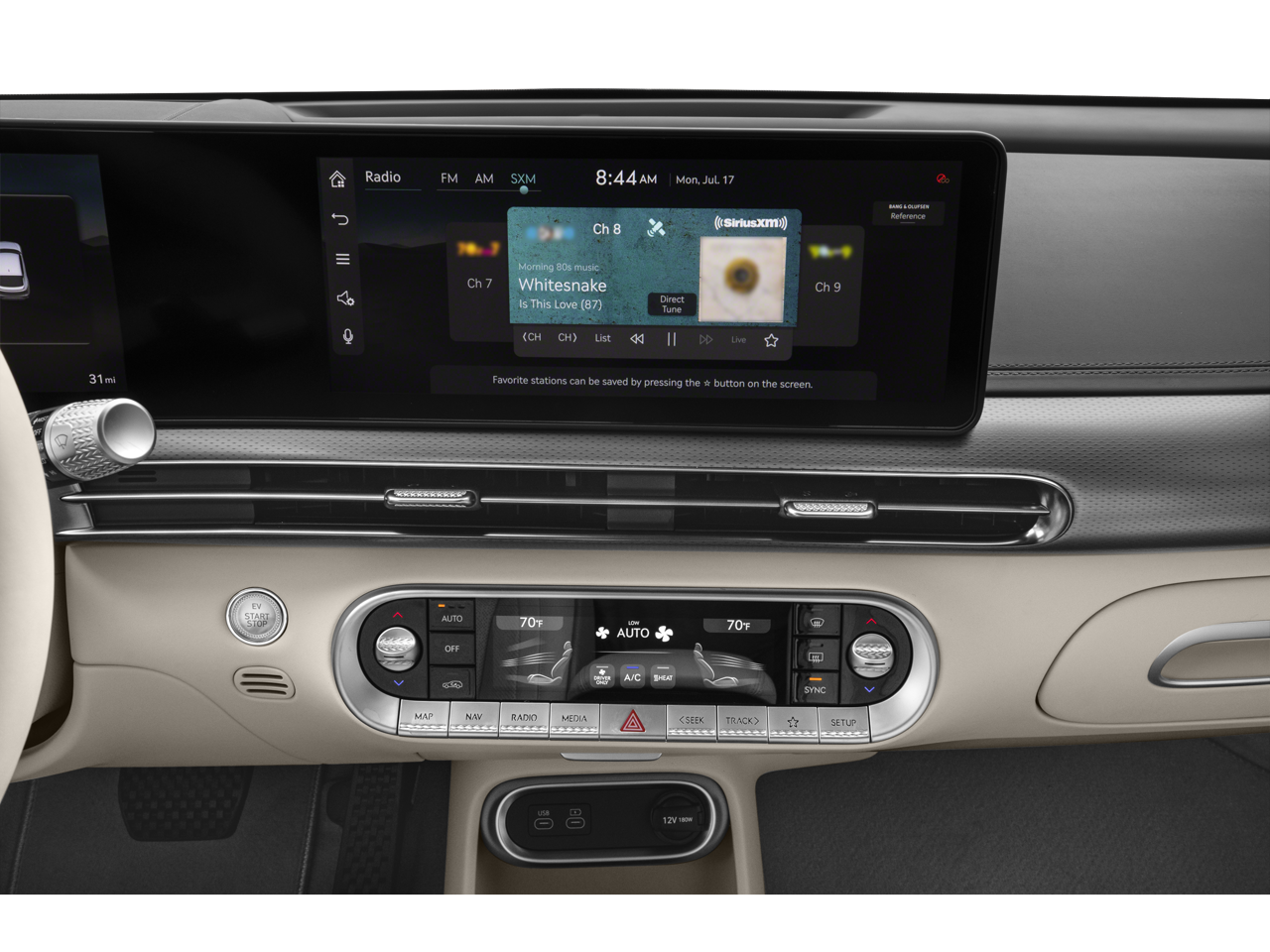 - Radio: AM/FM/HD Bang & Olufsen Premium Audio System -inc: 12.3" HD LCD display screen, navigation system w/cloud connected platform (cloud profiles, connected routing, dynamic voice recognition and OTA updates), SiriusXM Radio w/90-day trial subscription, 17 speakers, 14-channel amplifier w/1,400 watts max output, active noise control, Android Auto and Apple CarPlay, Bluetooth® hands-free phone system w/audio streaming, Genesis Connected Services, USB-C connectivity and Wi-Fi hotspot (3-month Wi-Fi or 3GB free trial) SiriusXM Radio not available in AK and HI.